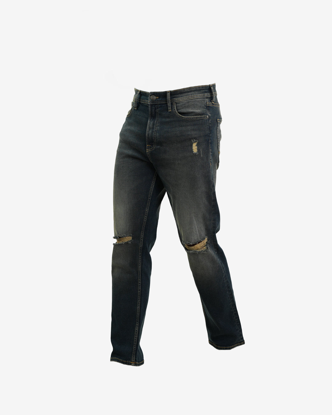 Cut in a straight silhouette for a clean, versatile profile elevated by ripped and repair detailing that adds character. Designed with a durable zipper closure and finished with high-quality buttons, rivets, and hardware for lasting wear. The construction ensures a premium, structured feel.